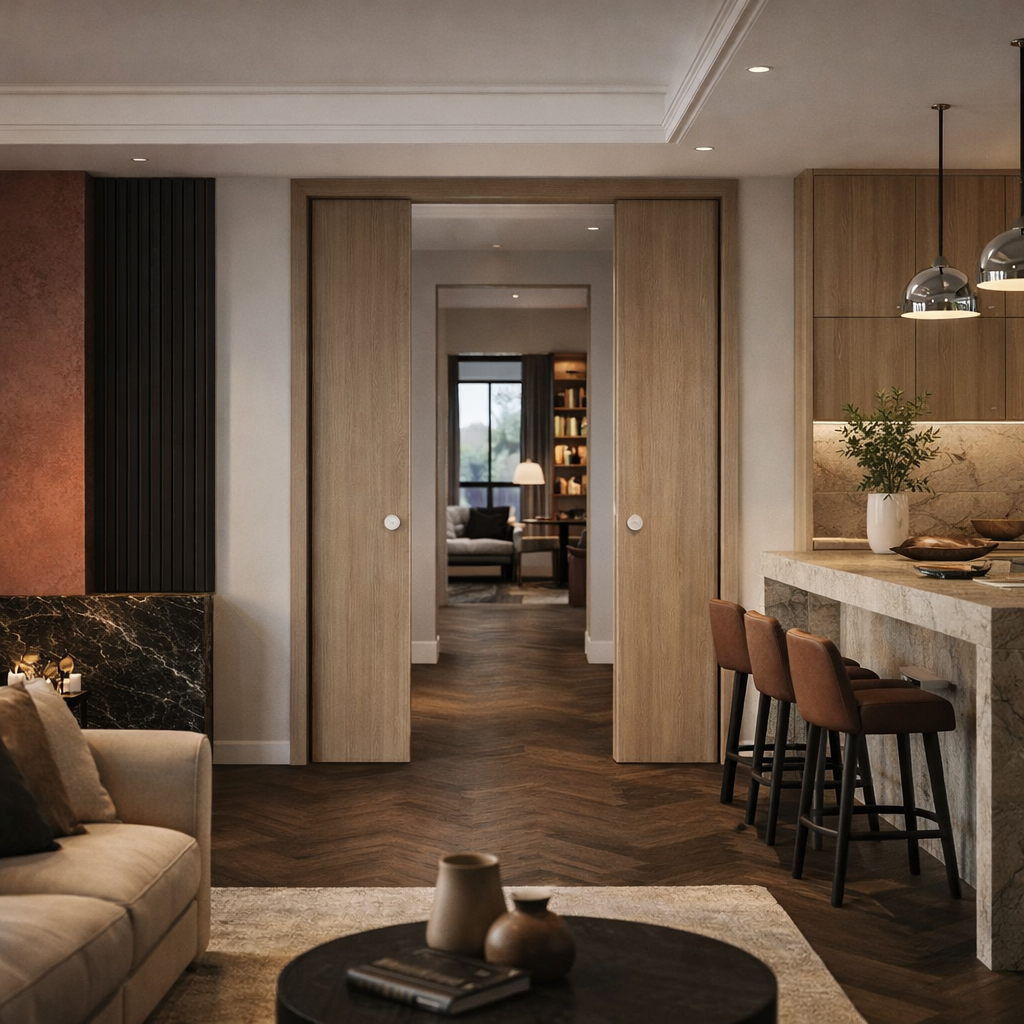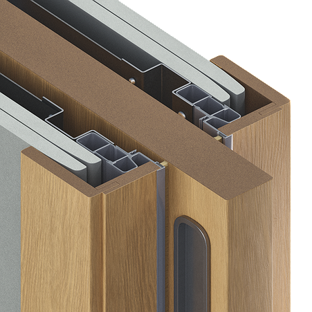Пенал, предназначенный для установки в проём двух полотен обрамлённых доборами и наличниками, и сдвигающихся в центр. Подходит для монтажа в стены толщиной до 150 мм. Может использоваться при новом строительстве или ремонте.
